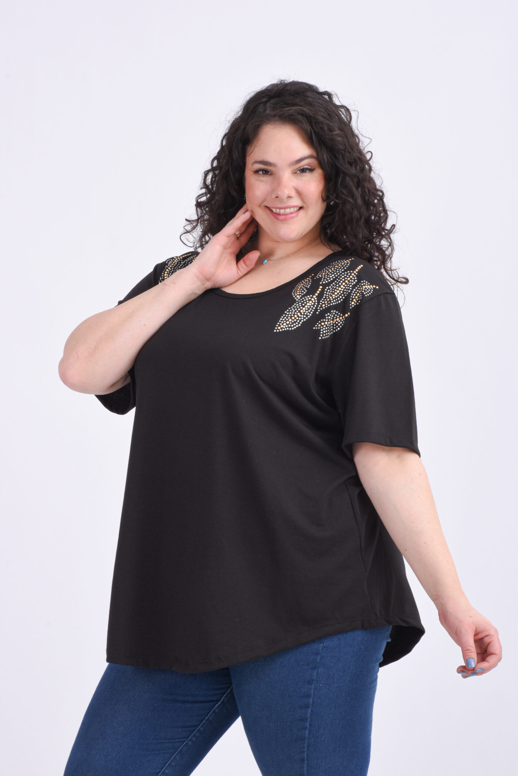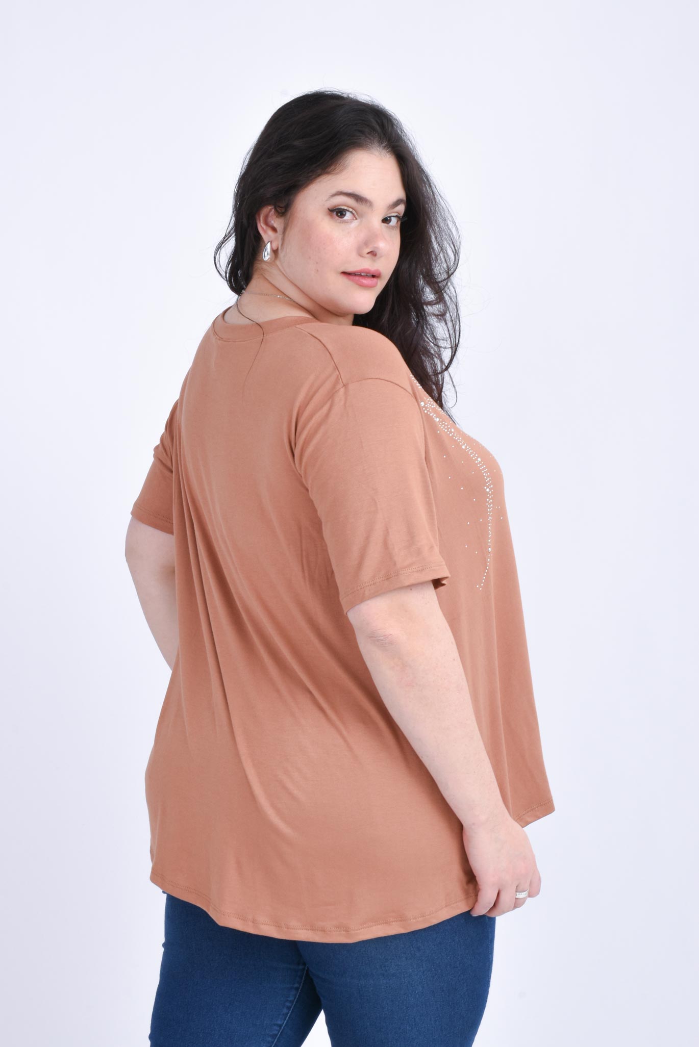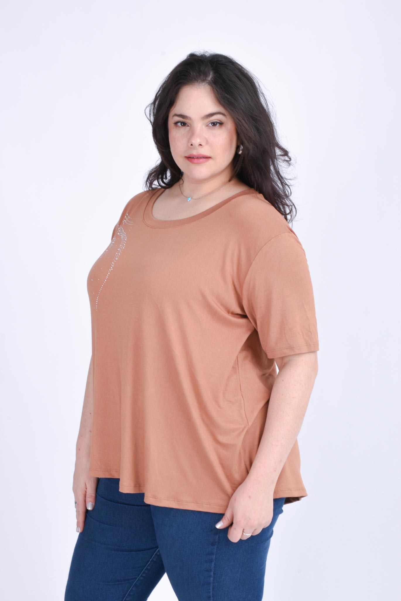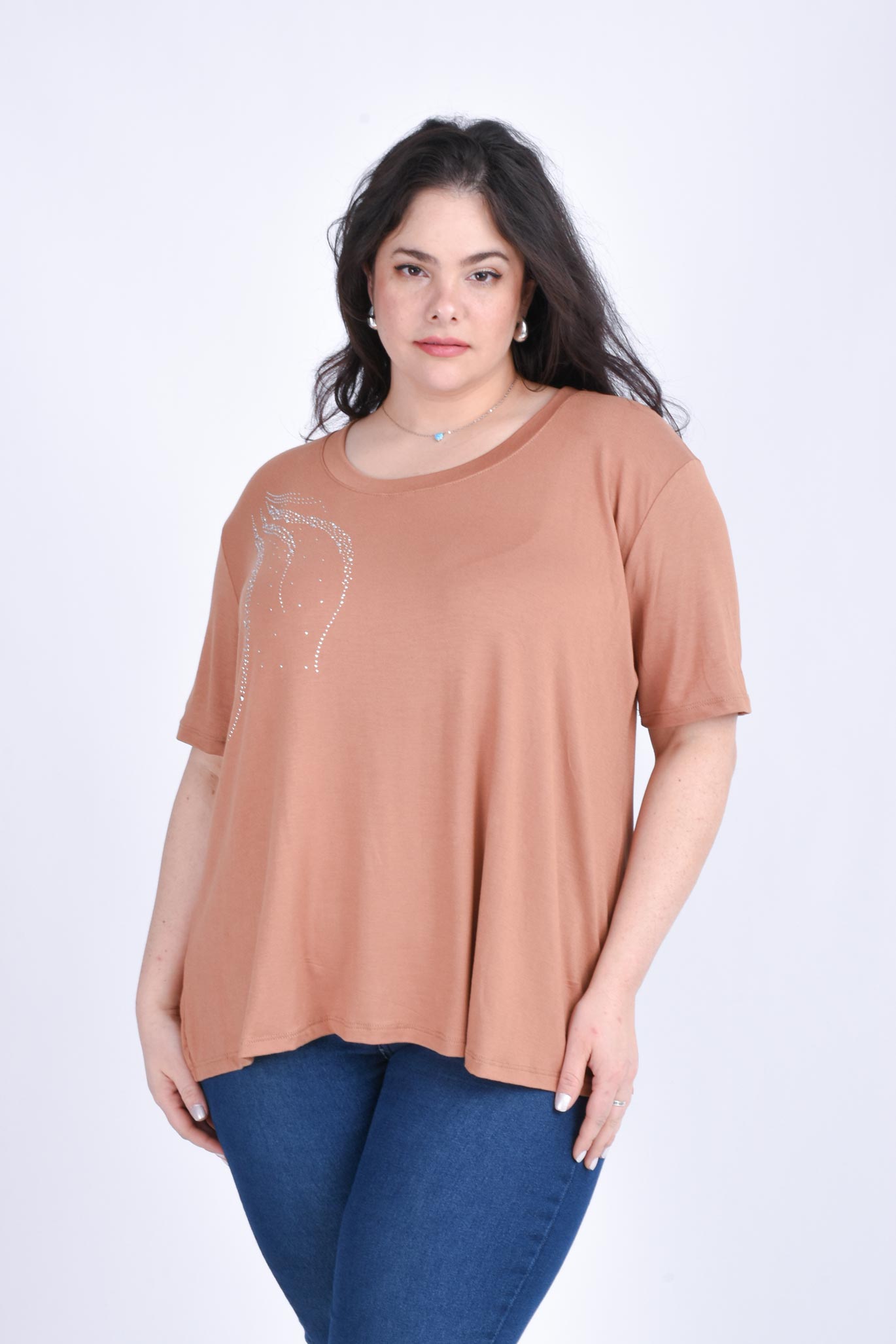 Remera de modal viscosa premium con escote redondo, caída evasé y diseño con brillo. Suave, liviana y elegante. Disponible en varios colores y talles especiales.
