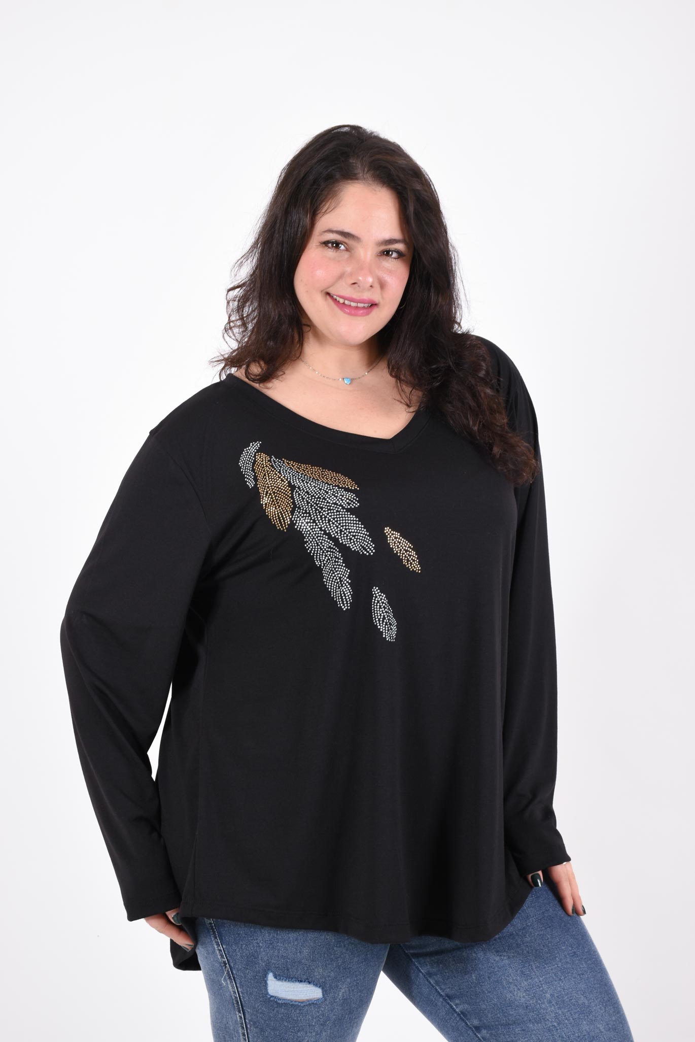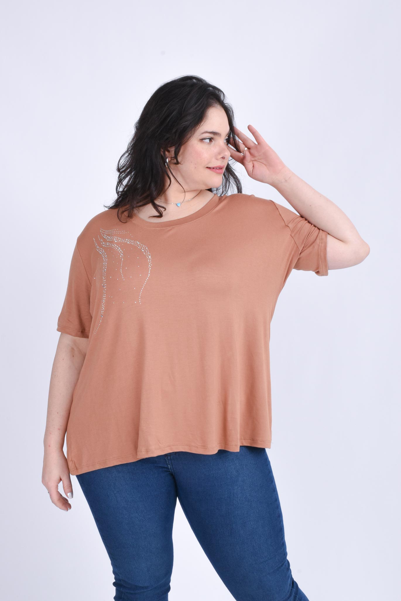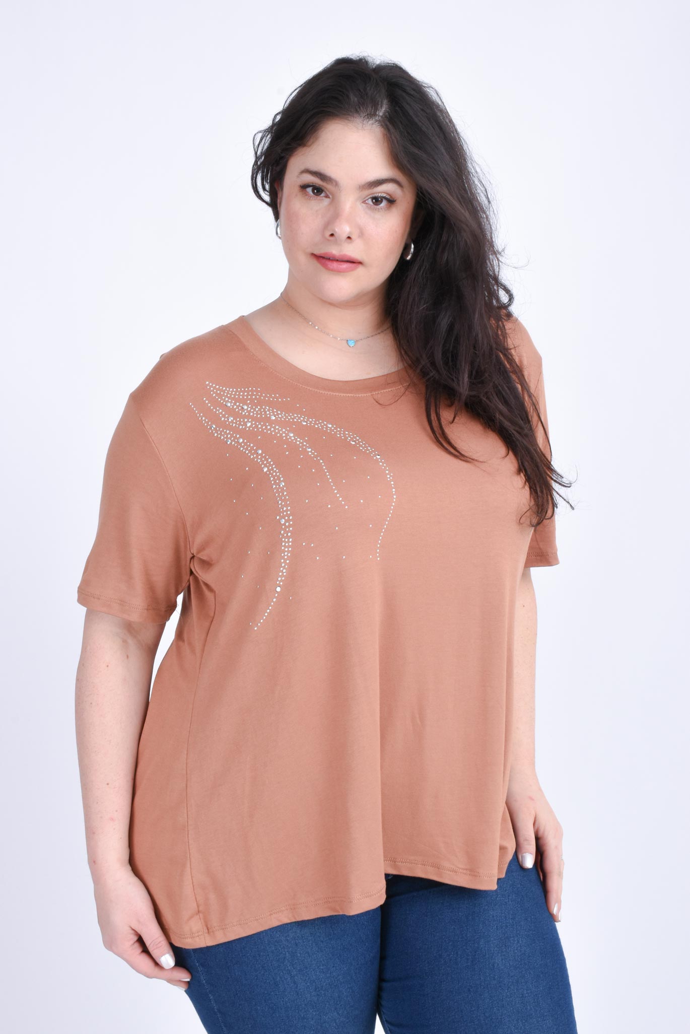 Remera de modal viscosa premium con escote redondo, caída evasé y diseño con brillo. Suave, liviana y elegante. Disponible en varios colores y talles especiales.