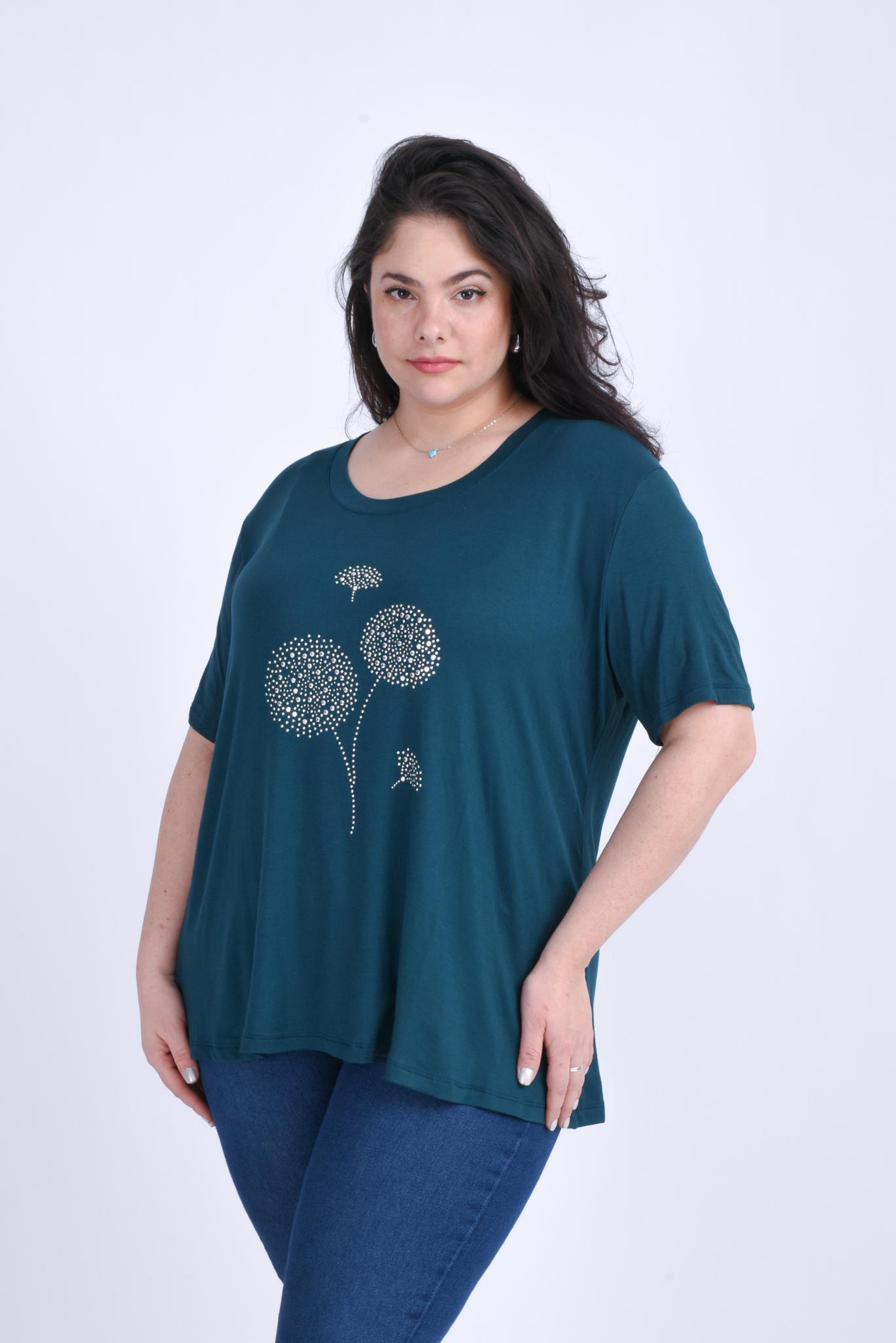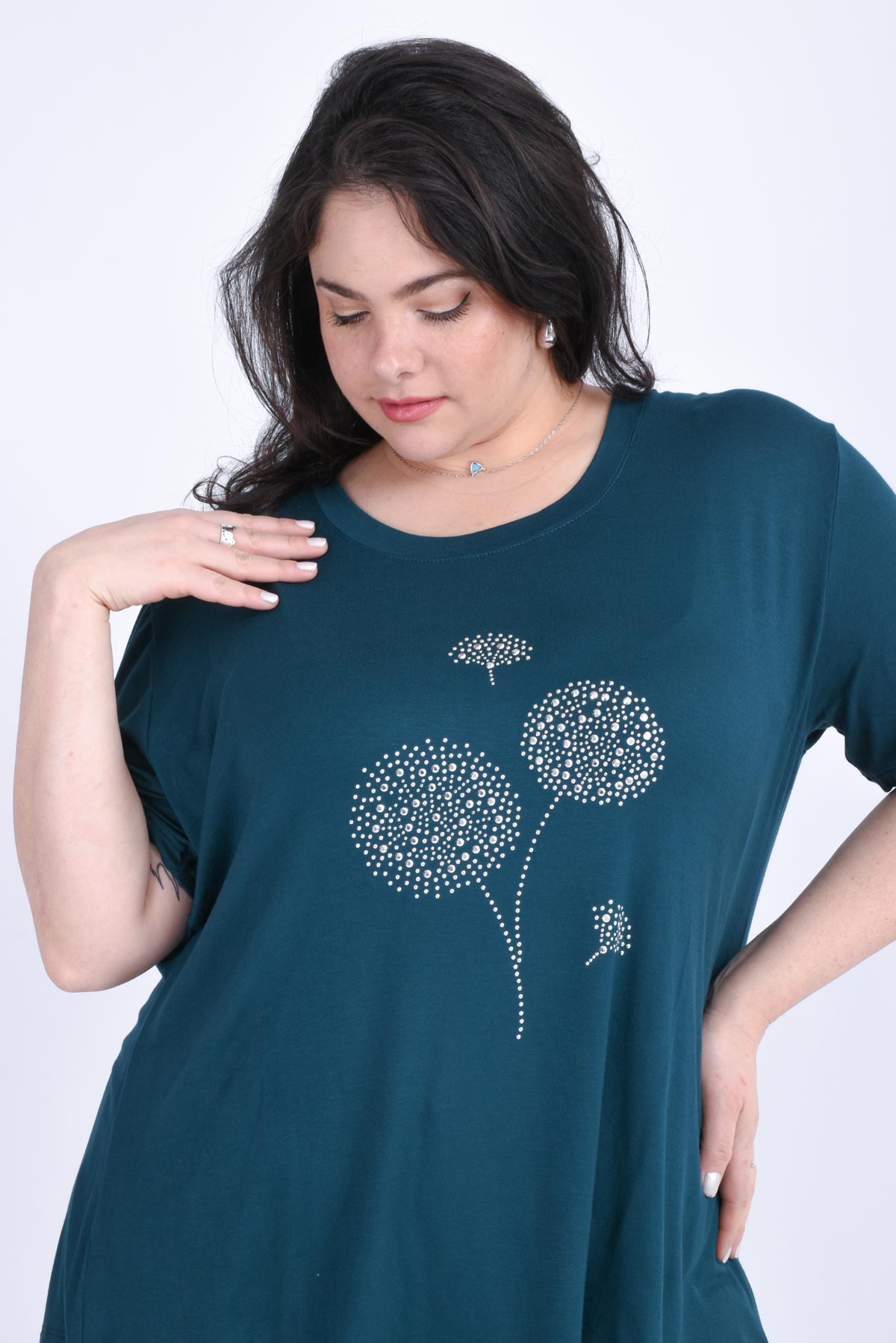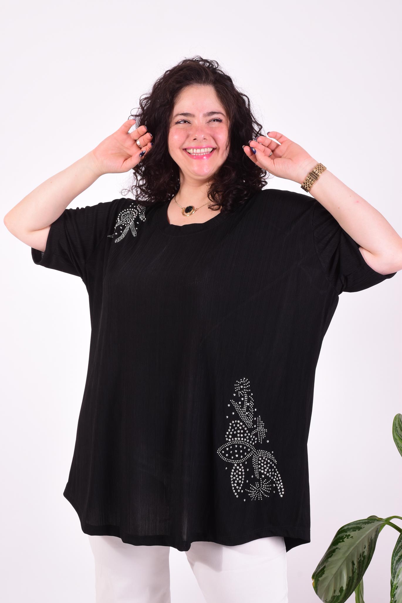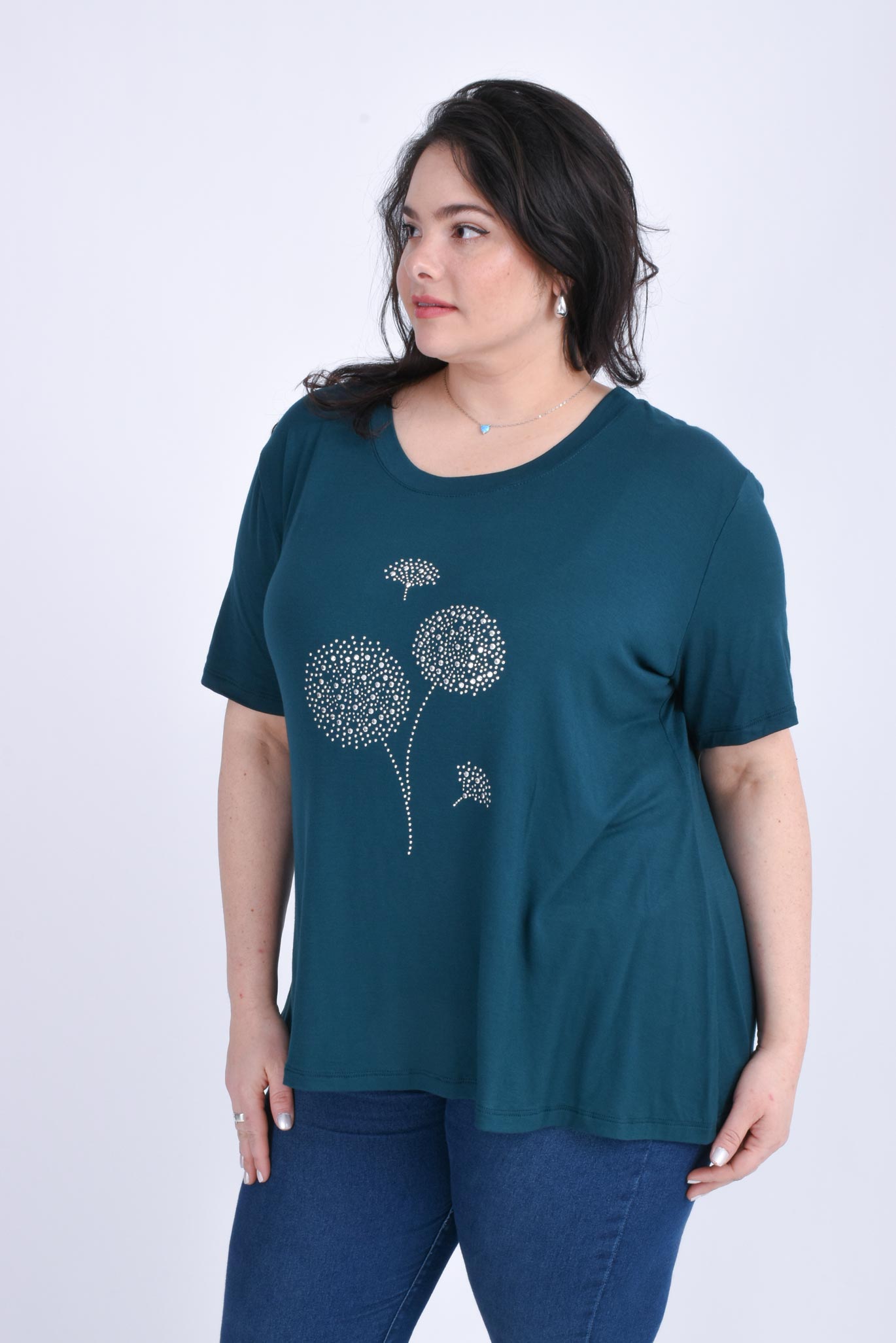 Remera de modal viscosa premium con escote redondo, caída evasé y diseño con brillo. Suave, liviana y elegante. Disponible en varios colores y talles especiales.
